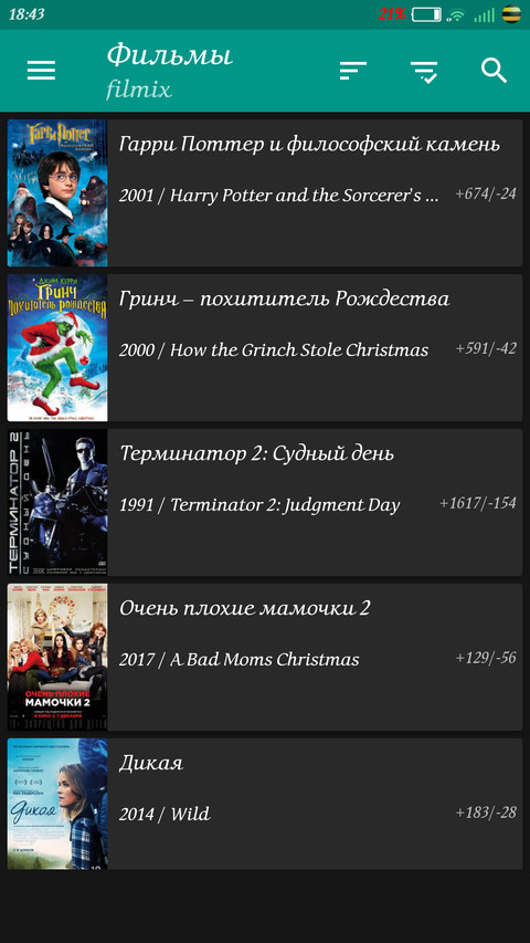 Поиск видеофайлов происходит на сайтах moonwalk.cc, tree.tv, zona.mobi, filmix.net, my-hit.org, tivio.net, kino-rex.com, kinokong.net. В настройках можно выбрать, по каким ресурсам производить поиск.