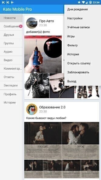 Kate Mobile для Android 4.1+ (Россия) - приложение для социальной сети ВКонтакте с богатейшим функционалом. Самое удобное, быстрое и надёжное. Самой главной отличительной особенностью является возможность подключать несколько учетных записей одновременно и быть в режиме невидимки. ФУНКЦИИ: ✅ Выбор темы оформления: светлая, тёмная, розовая, зелёная, оранжевая и другие; ✅ Настраиваемый размер шрифта; ✅ Работа с несколькими аккаунтами; ✅ Возможность установки на SD карту; ✅ Поддержка планшетов; ✅ Список дней рождения, уведомления о днях рождения; ✅ Голосовые комментарии: возможность записать свой голос и прикрепить его на стену другу; ✅ Новости. Комментарии к новостям; ✅ Список друзей, список друзей онлайн; ✅ Сообщения, диалоги, беседы; ✅ Фотографии. Добавление фотографии в альбом; ✅ Аудиозаписи. Добавление аудиозаписей с телефона на свою страницу. Кэш аудио; ✅ Видео. Добавление видео с телефона на свою страницу; ✅ Поиск музыки, видео, друзей, групп, сообщений, новостей; ✅ Уведомления о новых сообщениях, новостях, ответах; ✅ Возможность написать сообщение на стену, прикрепить фото, аудио, видео, граффити; ✅ Виджет новостей (тёмный/светлый); ✅ Группы и публичные страницы; ✅ Синхронизация контактов; ✅ Подписки/подписчики; ✅ Опросы (можно голосовать и создавать); ✅ Возможность сменить свою аватарку; ✅ Возможность не загружать картинки для уменьшения траффика; ✅ Прокси ViKa Touch. MOДИФИКАЦИЯ: ✅ Языки: Английский, Русский, Украинский; ✅ Оптимизирована графика в PngQuant; ✅ Удалена аналитика/реклама; ✅ Удалена проверка на эмулятор Android; ✅ Удалена зависимость от Google play services; ✅ Удален автозапуск при загрузке; ✅ Удалены дубликаты графики; ✅ Удалена отладочная информация; ✅ Отключено обновление; ✅ Сжатие приложения в режиме Ultra.