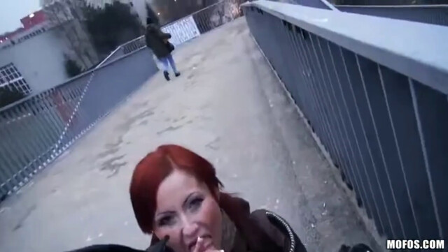 Минет на мосту. Немного стесняется прохожих, но не прекращает сосать.